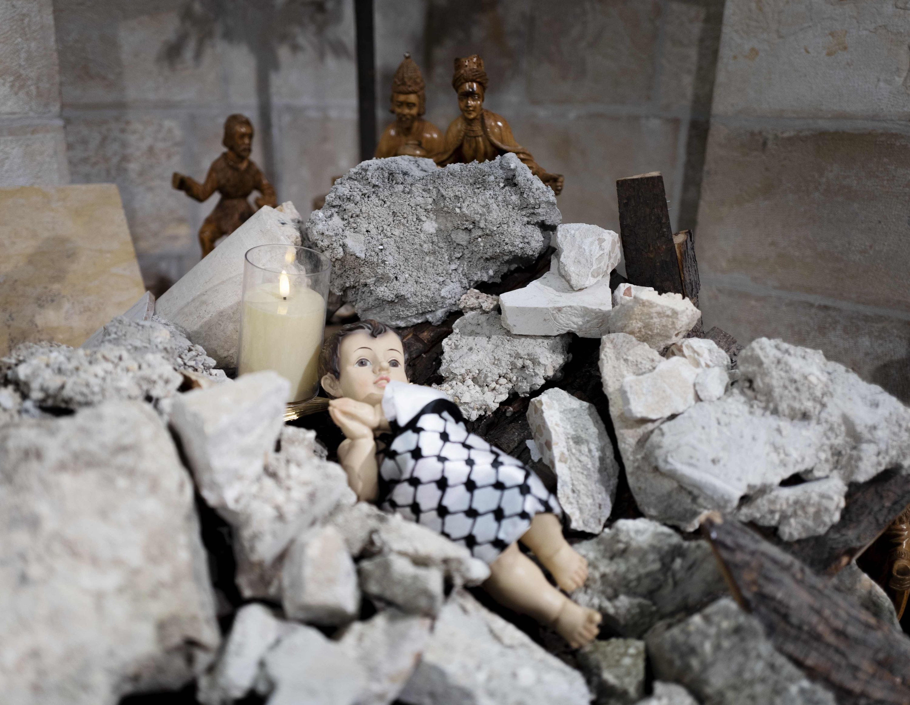 Bethelem crib: the Christ Child amid the rubble of bombed homes.