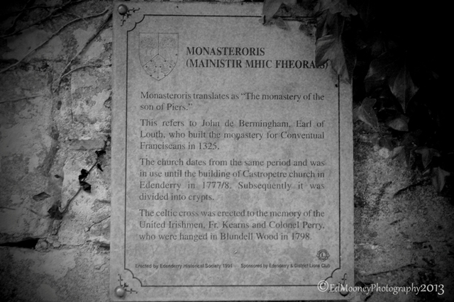 The name of this friary comes from the Irish version of the founder’s name – John de Bermingham, Earl of Louth (MacFeoris – Monaster Feoris) – who brought the friars there in 1325. The Observant reform was adopted in 1506. While in use as a fort by the Irish, the building was severely damaged during a siege by the Lord Lieutenant in 1521. The friars were able to remain in the area for about another fifty years. They returned to the site of their old foundation about 1645.