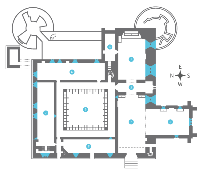 Remains: church, tower, transept chapel, friary and some outbuildings are complete; note how the ruins of the old castle have been skilfully incorporated into the friary, also the gigantic tomb of the Butlers of Dunboyne in the room beside the refectory.